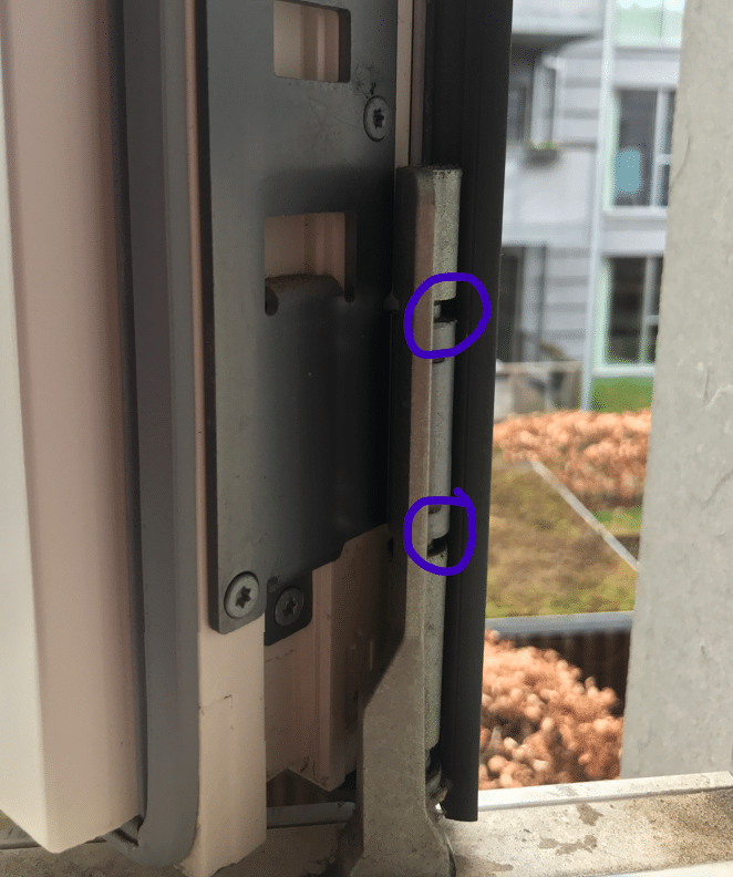 Alle bevægelige dele i vinduet skal have olie. Benyt en oliespray uden syre, vi har en i afdelingen du kan låne. Du skal blandt andet give olie her: